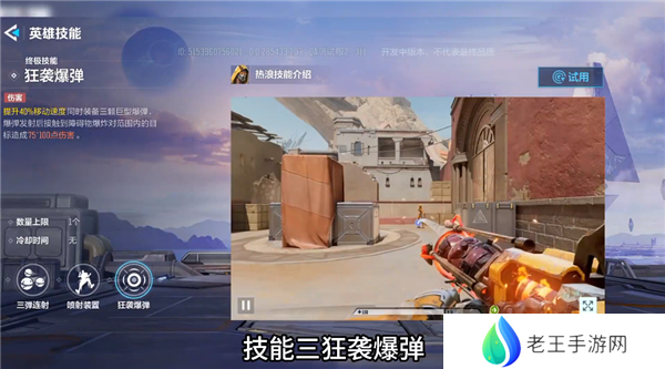 第三个技能狂袭爆弹,发射三枚巨型爆弹造成大范围伤害,基本擦到了就会阵亡,对于躲在障碍物后面的玩家非常有用。