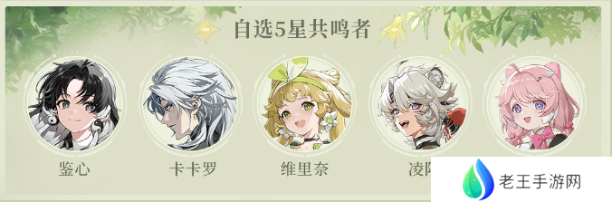 新手抽卡会开启自选五星角色活动,可自选的角色为:鉴心、卡卡罗、维里奈、凌阳、安可;