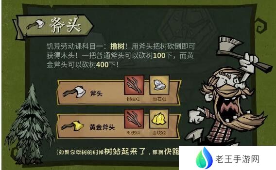 饥荒劳动课科目一:撸树!用斧头把树砍倒即可获得木头!一把普通斧头可以砍树100下,而黄金斧头可以砍树400下!