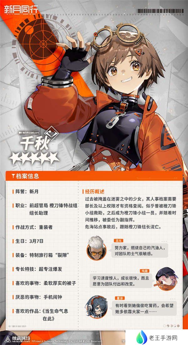 新月同行千秋技能介绍,五星重装千秋。过去被掩盖在迷雾之中的少女,其人事档案需要部长及以上权限才有资格查阅。似乎曾被橙刀锋小组救助,之后成为橙刀锋小组一员,并随着时间推移,被委任为副指挥。