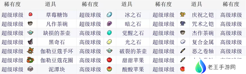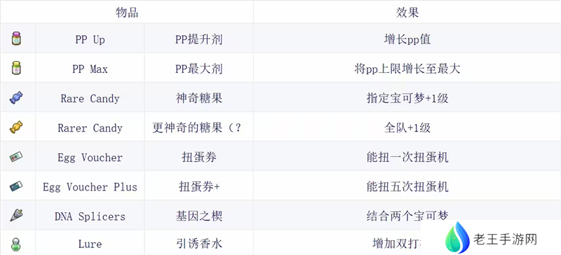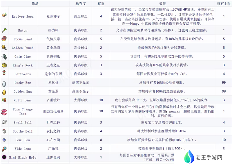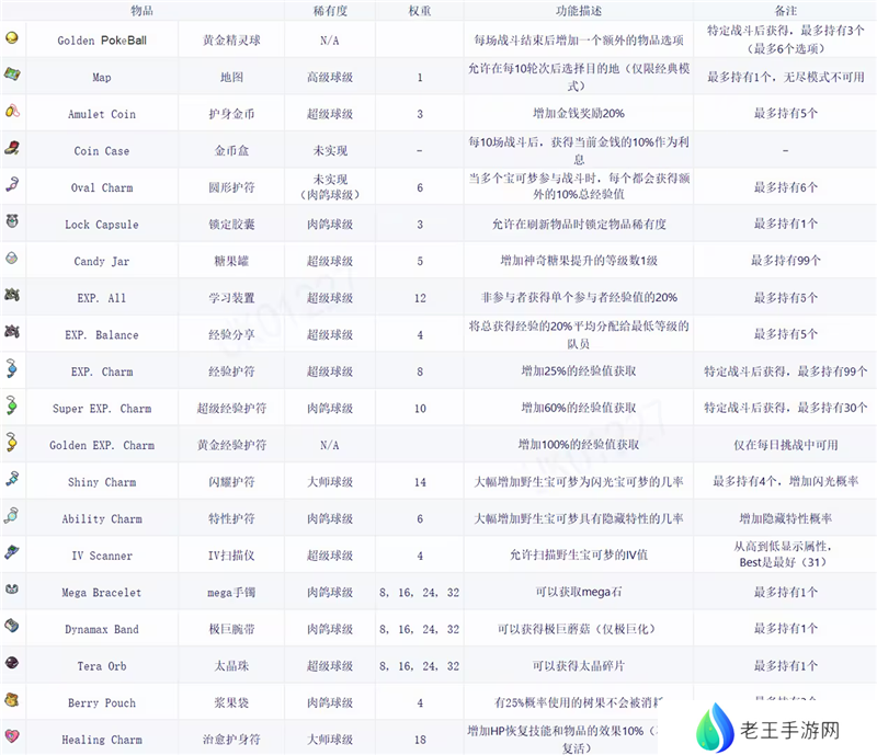 游戏内道具分为携带道具,持有道具(重要道具),消耗品三类,细分下来还有树果,努力药等,以下会详细介绍每个类里面较为重要的新物品和有改动的原版物品。