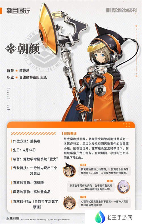 新月同行朝颜怎么样介绍,重装者朝颜。经大学教授引荐,朝颜接受超管局测试并成为一名医疗特工,后加入专攻空间污染事件的白雏鹰小组。