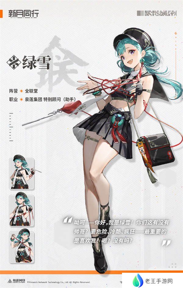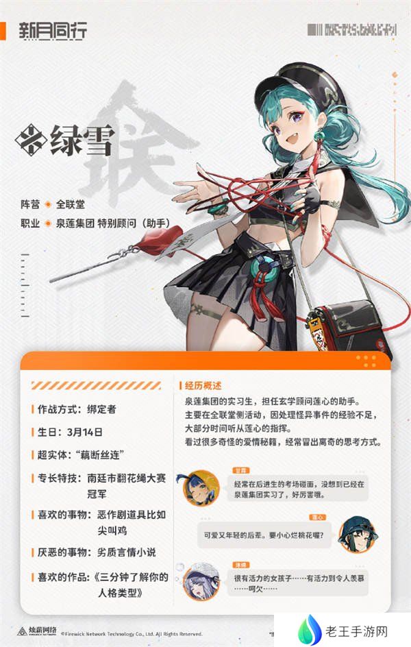 新月同行绿雪技能介绍,绿雪立绘分享。泉莲集团的实习生,担任玄学顾问莲心的助手。