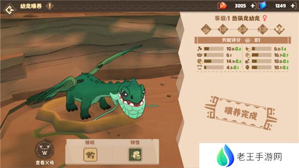 7、小龙孵化后,需要点击小龙头上的感叹号进行快速喂食或喂食。快速喂食将会跳过喂食阶段以当前属性获得成年龙;喂食可以挑选食物进行喂养,不同食物可以增加不同天赋值,同一只小龙最多喂养3次。