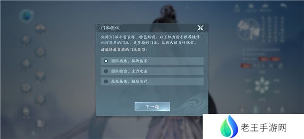 第二步,完成下载后,踏入江湖的门槛,选择心仪的无界新区作为您的起点。接下来选择门派的时候不妨先通过右上角的门派测试,完成三个简单选项,系统将为您推荐最适合的门派,助您明确江湖定位。
