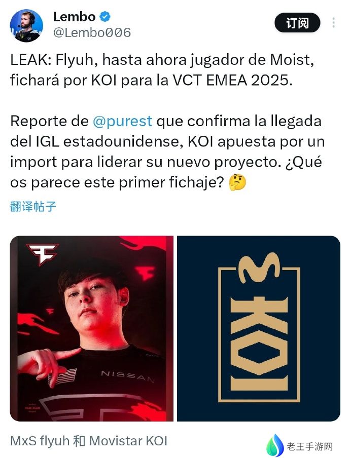 根据媒体人Lembo消息,Moist战队的选手Flyuh将加盟KOI战队,参加VCT EMEA联赛 2025赛季。