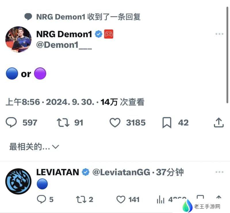 2023冠军赛冠军成员、现NRG战队选手Demon1在社交媒体上发布了一条引人关注的推文,仅用两个颜色——蓝色和紫色,暗示了自己未来的去向。