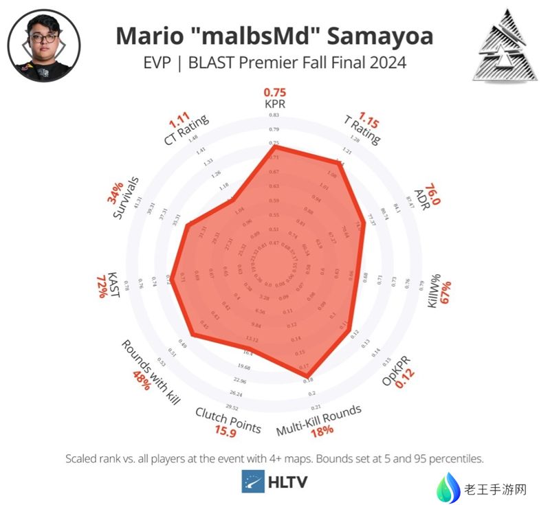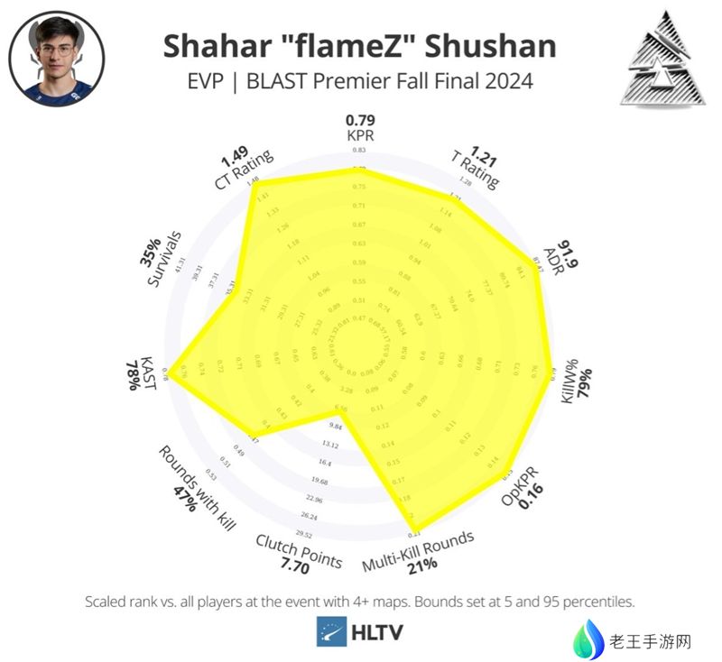 尽管flameZ位列榜单最后一位,但他和ZywOo的差距并不大。他有着1.35的rating、1.59的Impact rating和获胜回合118.5的伤害值。单独看都是MVP级别的数据。