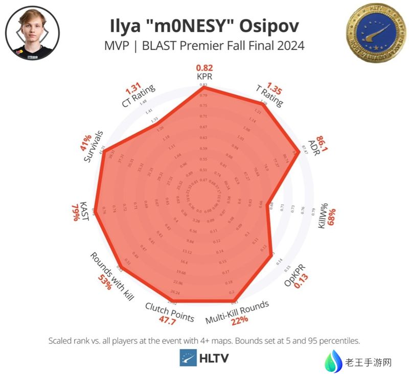 遗憾的是他决赛中只有0.87的rating,但我们不能抹杀他决赛前的出彩发挥。他小组赛对阵G2时有着25-11的数据(10-3支配m0NESY)。不过高光要到对阵FaZe,他有着21-13的数据,还有一个精彩绝伦的1v2残局。