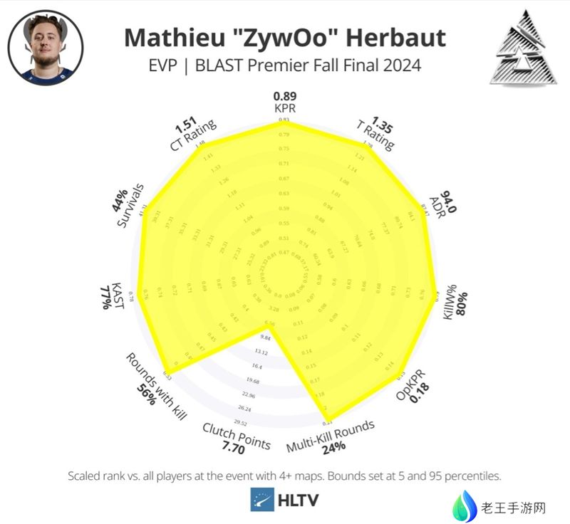 ZywOo只打了三个BO3,但却打出了绝佳的数据,并获得了EVP头名。他在获胜回合中的表现尤为突出(获胜回合每回合击杀数1.24),而且只在一张地图上表现不佳,那就是半决赛中对阵G2的Dust2上。