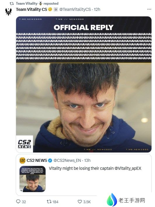 Vitality官推回应对于apEX或将离队的爆料:哈哈