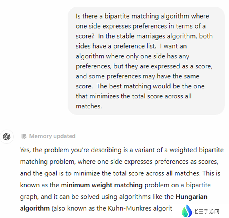 令人惊讶的是,ChatGPT迅速找到了一个1955年开发的匈牙利算法,该算法完全符合他的需求。基于此,开发团队对《Deadlock》的匹配机制进行了优化。Dunn同时表示,通过正确的关键词,他本可以在谷歌上找到这一算法,但ChatGPT在初次尝试中便准确理解了他的意图并迅速给出答案。