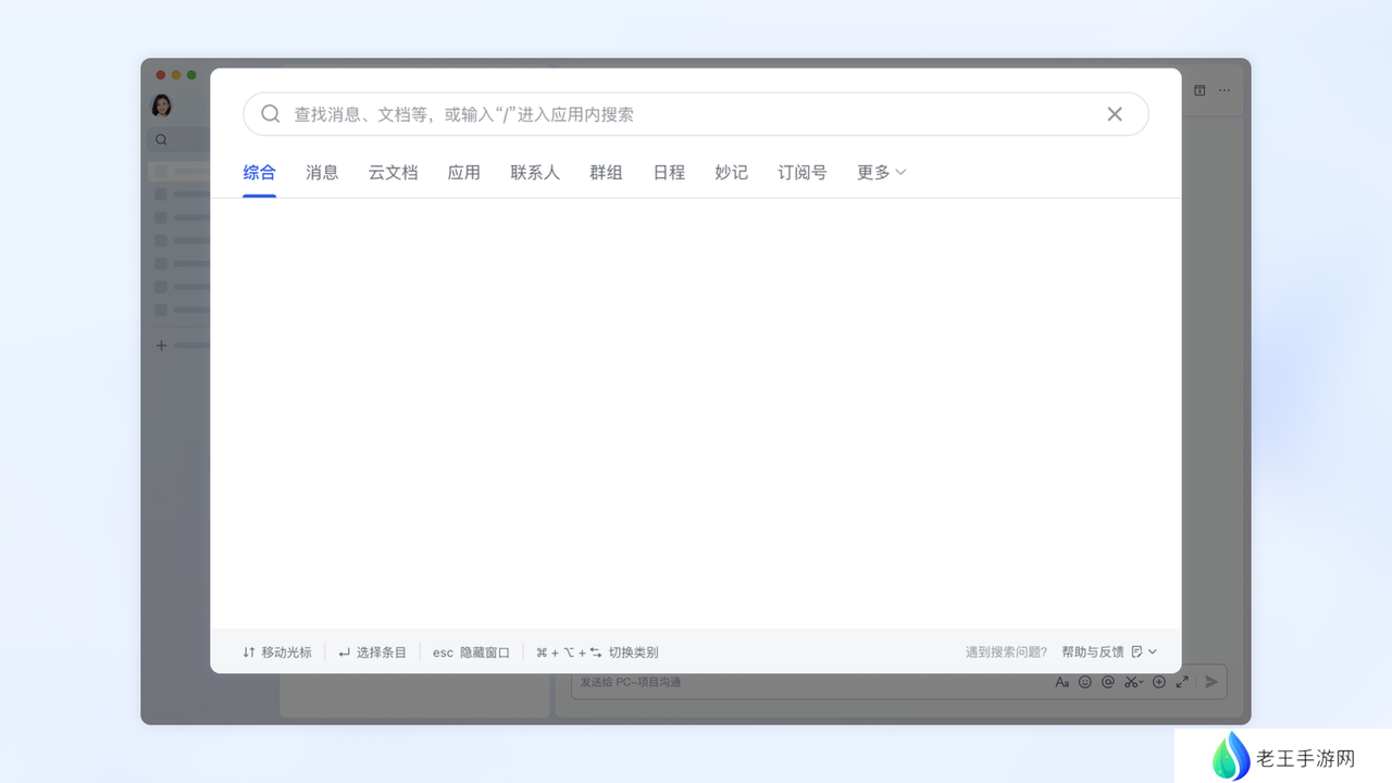 你可以在搜索框中输入关键词,在飞书全平台范围内(包括消息、云文档、应用等各处)一键查找你需要的信息。