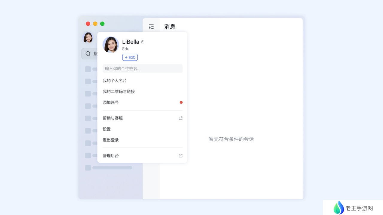 点击个人头像后,你可以修改你的姓名、头像、状态等个人信息,也可以在这里添加账号、找到帮助与客服、进入设置页面等。