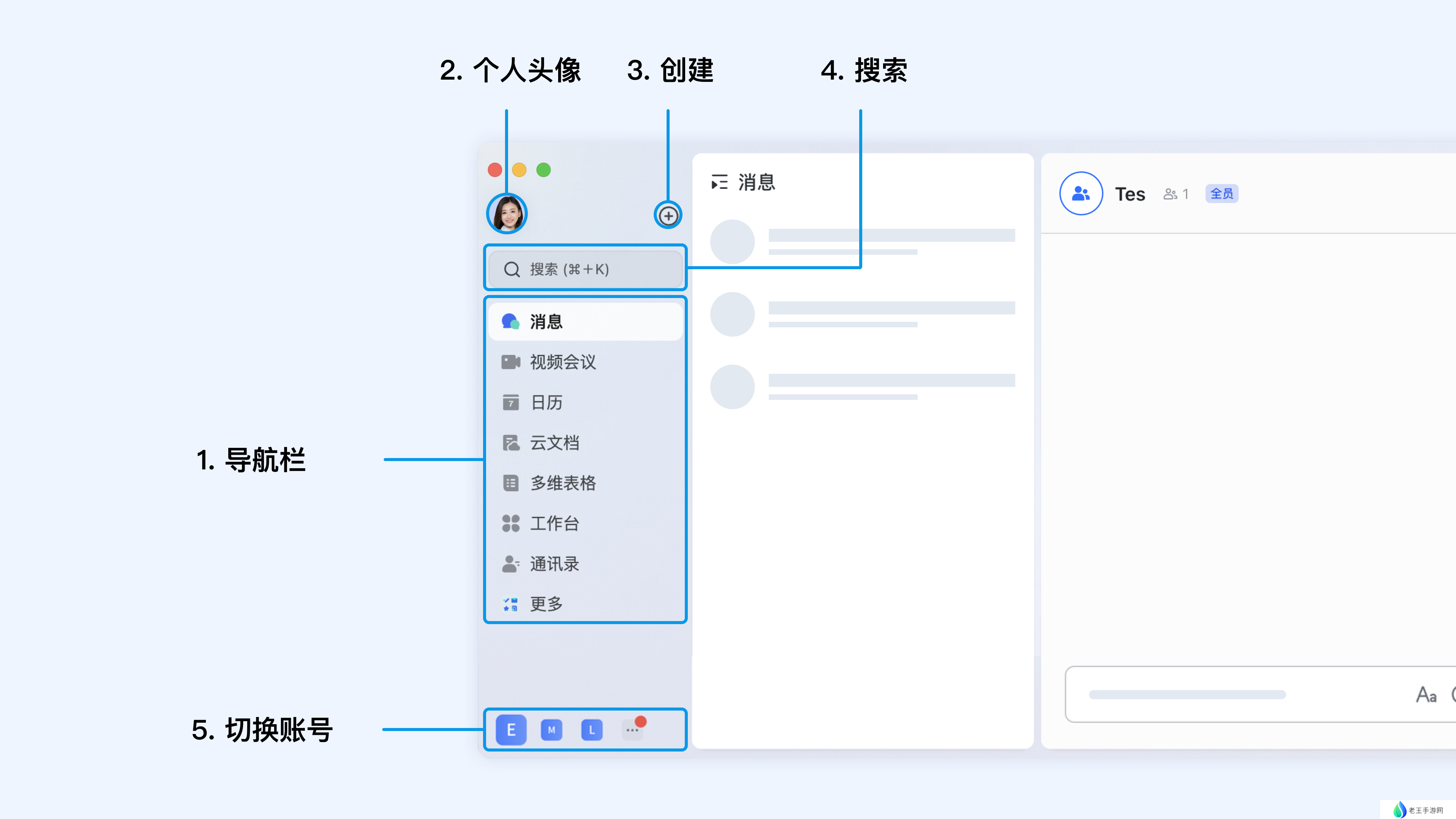 导航栏提供了各功能的入口,你可以快速进入消息、视频会议、日历等功能,并直接在飞书中打开使用,无需跳转外部浏览器。