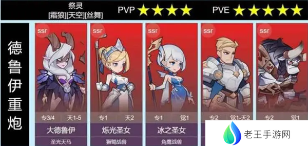 阵容解析:主养德鲁伊,主动用觉醒变身,月火超高伤害点杀,前排圣骑和牛,确保坦度,冰女可以酌情更换为增益辅助,月神或女王,圣女保一手免控,也可直接替换另一个副C或控制,毕竟枭兽就算免控受击还是会被打断。