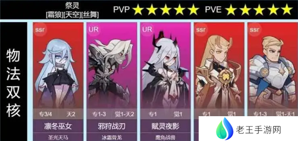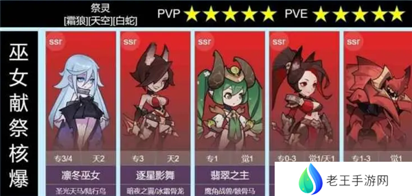 阵容解析:主巫女,副邪狩,赋灵和青铜功能性质辅助,不需求高练度,骑士需要给一定养成,或更换成其他坦克,阵容实用性广,pev和pvp都有不错表现。物法双核可以应付绝大多数阵容。