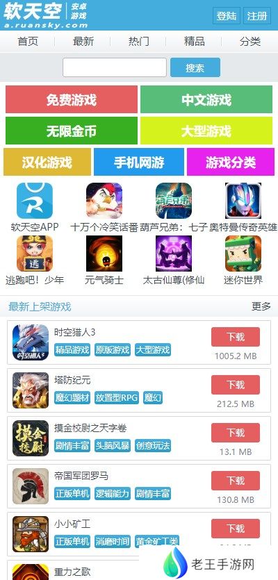 以上就是软天空的pc和m端的网址了,每天都可以打开去下载自己所心仪的游戏,有免费游戏、汉化游戏、无限金币游戏任君挑选!