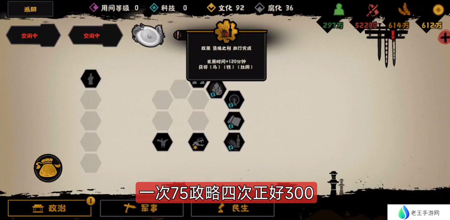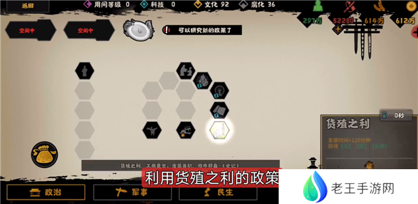 2、不需要完成前三个阶段任务,开局不用管其他事件,直接进入政策界面利用利用货殖之利的政策快速消耗政略;