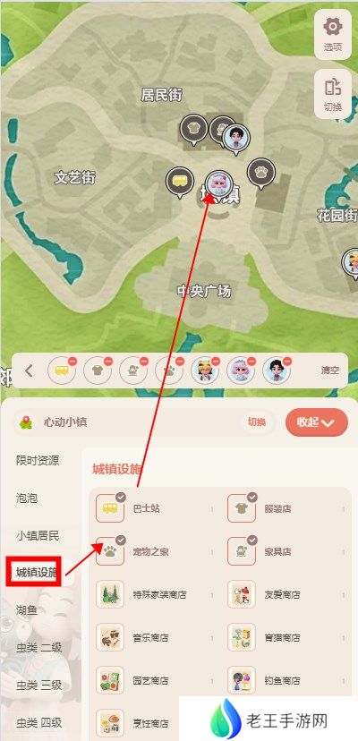 2、选择城镇设施,然后会有巴士站、服装店、家具店这些地图信息,勾选以后就会相对应的在地图上显示出位置来。