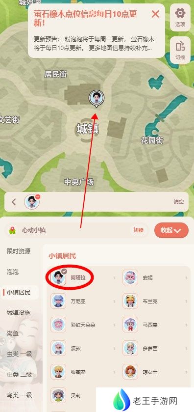 3、以小镇居民为例,选择阿塔拉就可以在地图上看到阿塔拉的位置。