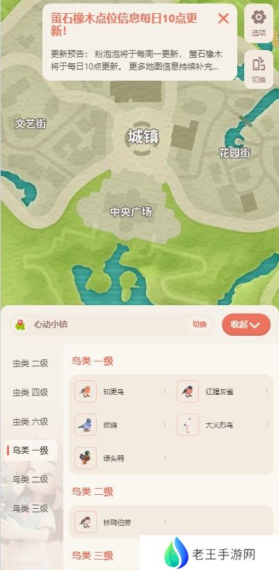 心动小镇地图使用教程:1、地图工具进入之后可以查看每日萤石橡木点位信息,每日十点就会更新,下面还有鸟类,小镇居民,城镇设施等点位地图可以使用。