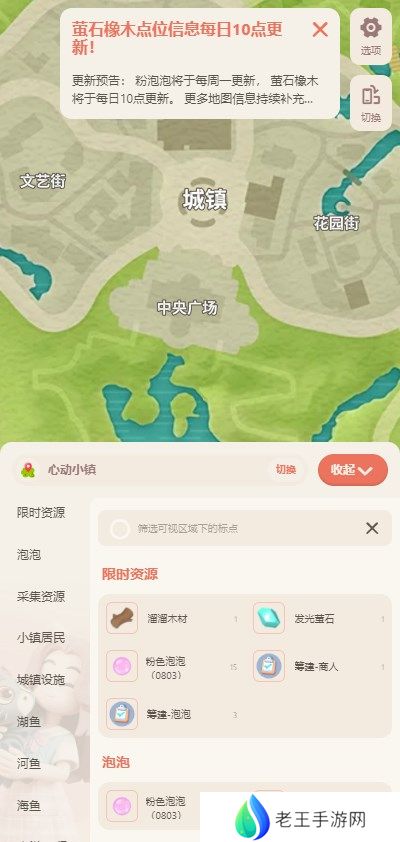 心动小镇地图工具可以帮助玩家隐藏已标记点位,筛选可视区域下的标点,新建标记点等等功能,无论是限时泡泡资源还是鱼类,鸟类,虫类,小镇居民,城镇设施都可以在地图上标记出来,感兴趣的快来试试吧,告诉大家心动小镇地图工具网址在哪儿。