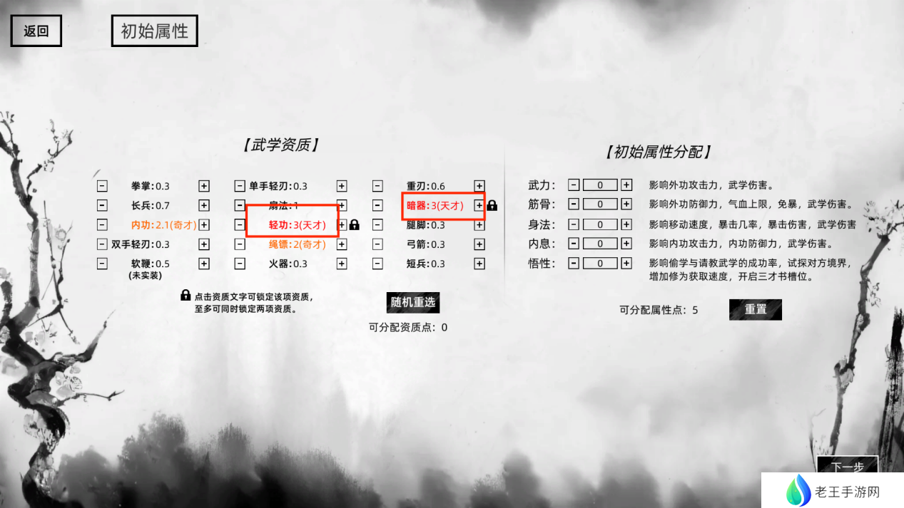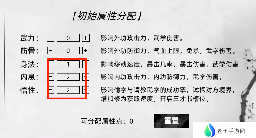 在游戏初期,可将初始属性分配给身法、悟性和内息,因为在离开青萍村之前,属性要求不会过于严格。完成青萍村的突破任务后,再考虑分配武力和筋骨等属性。