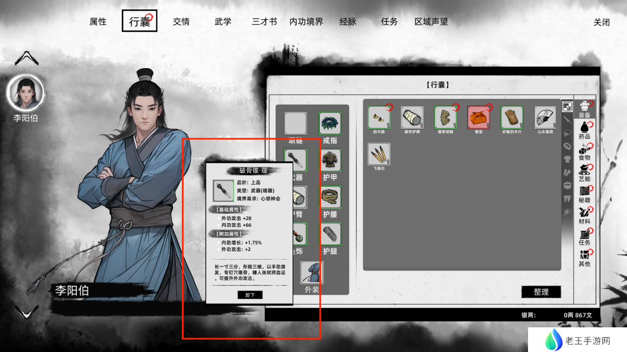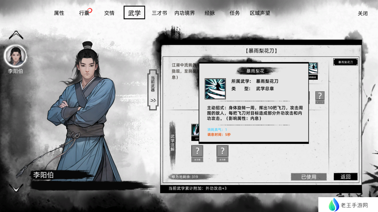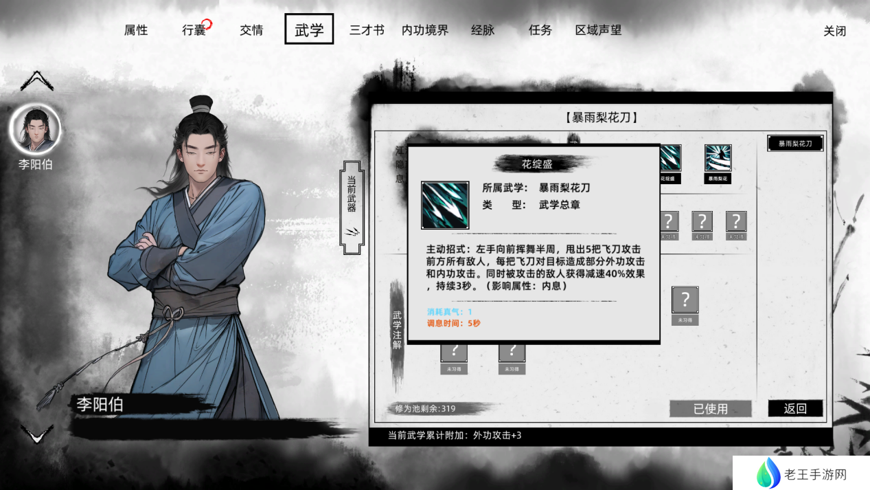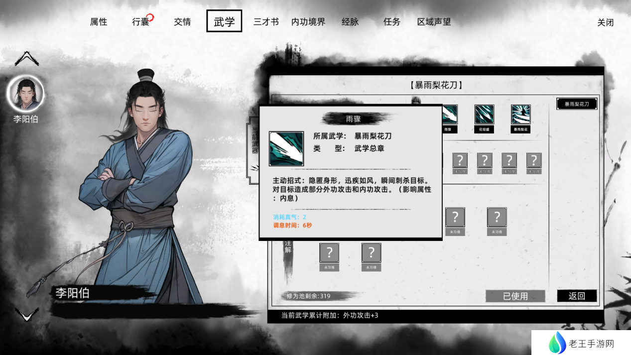 至于武学资质,务必至少将暗器技能提升至3级,轻功技能为了赶路方便也推荐提升至3级,其余点数可根据个人需求进行分配。