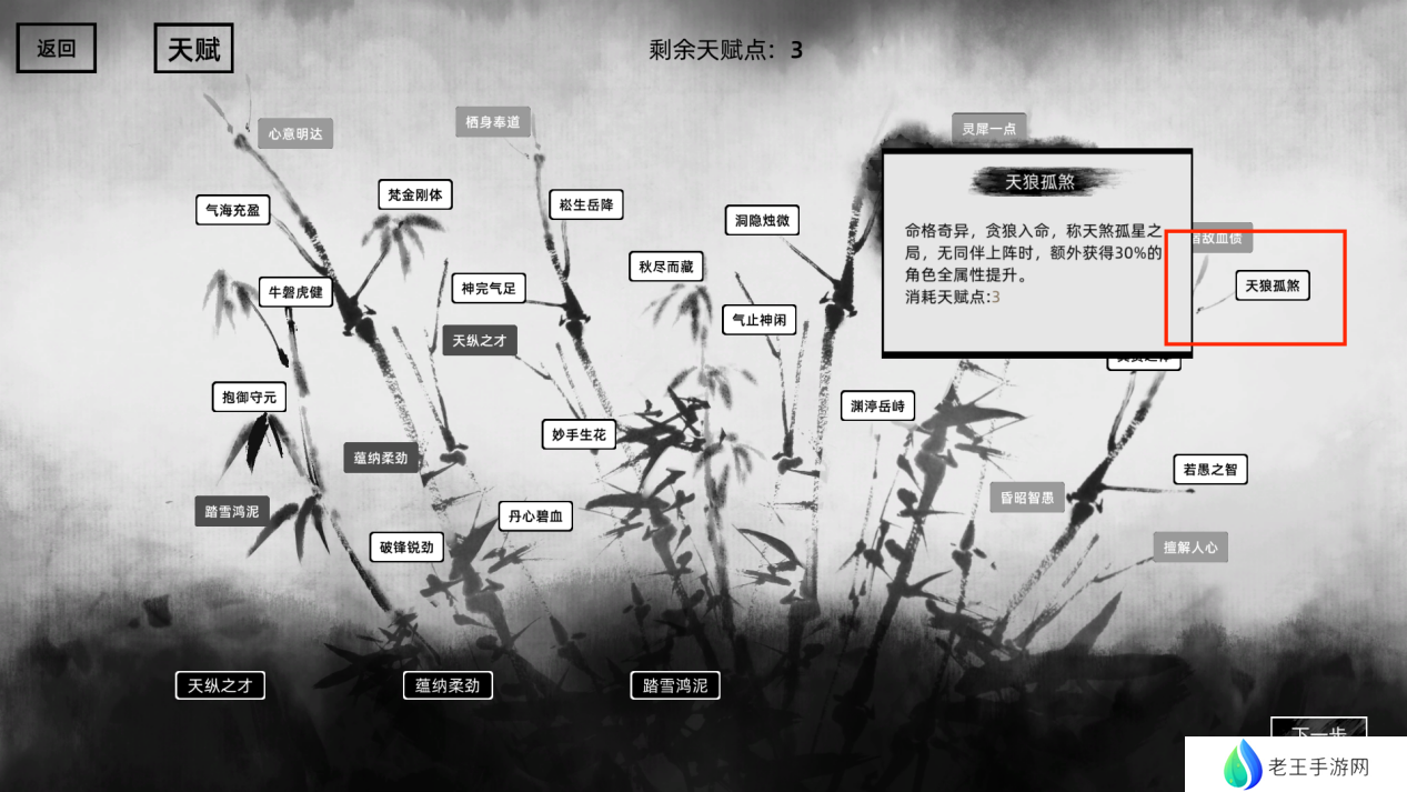 单独战斗的时候全属性增加30%,由于大部分的时候我们都是单打独斗,且同伴的攻击欲望并不高,所以也可以选择这个天赋,但是这个天赋和天纵奇才只能二选一,需要玩家自行斟酌。