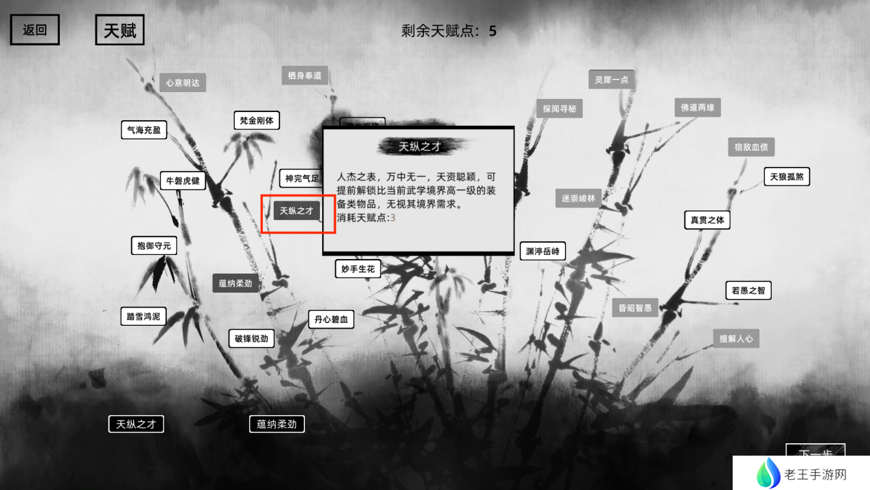 天纵之才:人杰之表,万中无一,天资聪颖,可提前解锁比当前武学境界高一级的装备类物品,无视其境界需求。