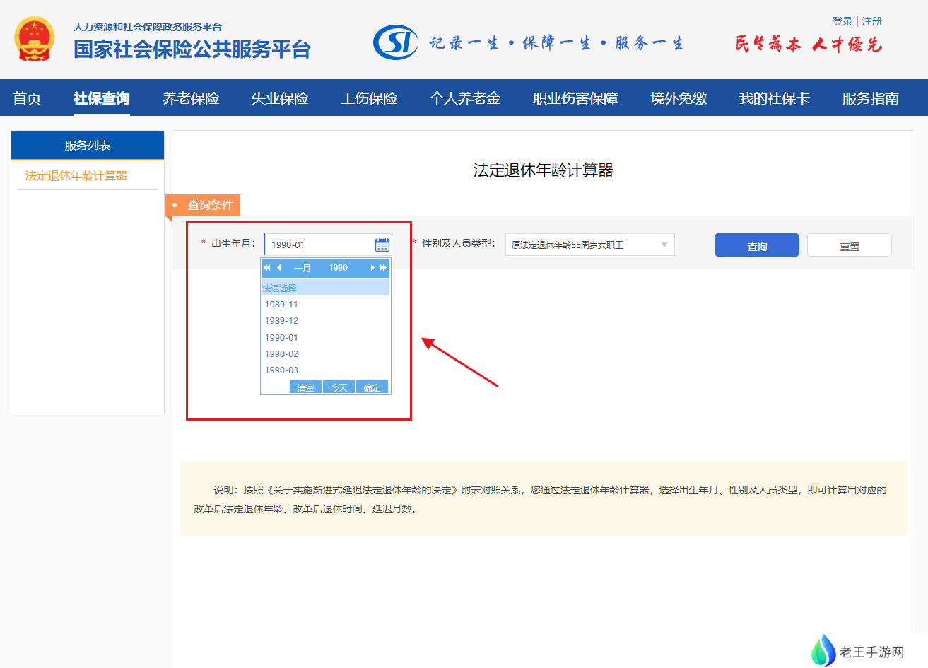 如图所示,您需要填写你的出生年月,这里以1990年1月出生的职工为例;
