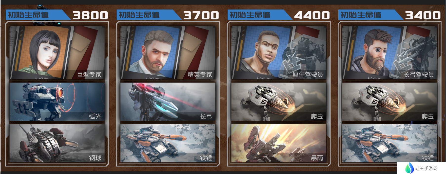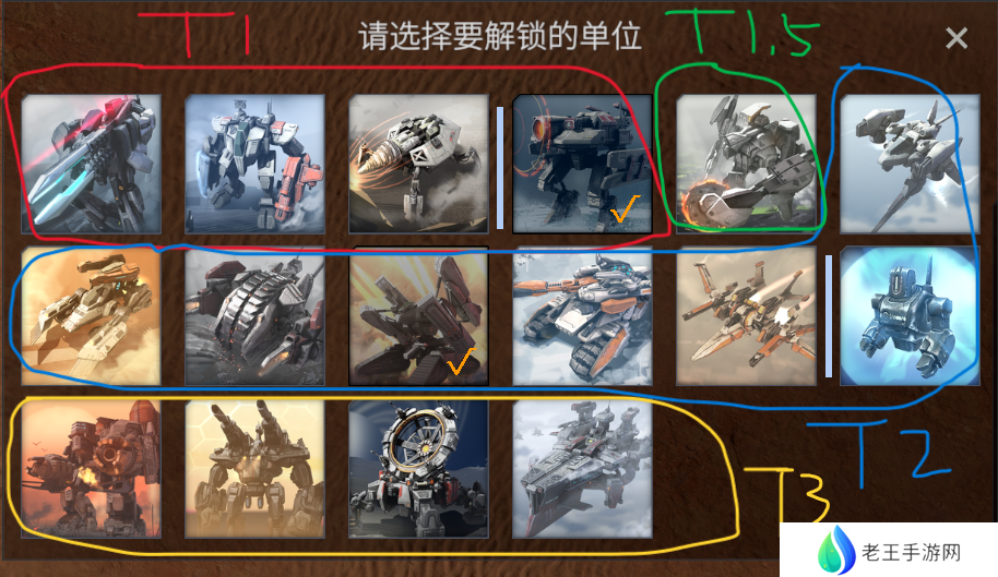 第一回合开始时,双方都有四个初始开局可以选择,但是这个初始开局双方是不一样的。初始开局包含一个专家,两队t2,三队t1,并且解锁对应的单位。(t2是指用50块钱解锁200购买的单位,t1是指0解锁费100购买的单位,t3专指200解锁400购买的巨型单位)同时每个初始专家的血量是不一样的。