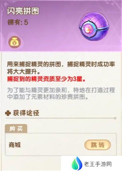 如果希望获得一只高资质精灵,最简单的方式就是使用高品质拼图进行捕捉,例如“闪亮拼图”捕捉到的精灵资质至少为3星,基础属性值比较高