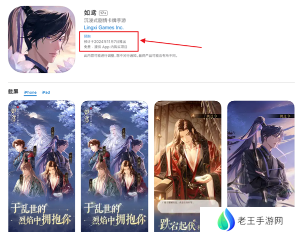 iOS的App Store上现可看到《如鸢》预计于2024年11月7日推出,大概率是和安卓同步上线,玩家可以期待一下。