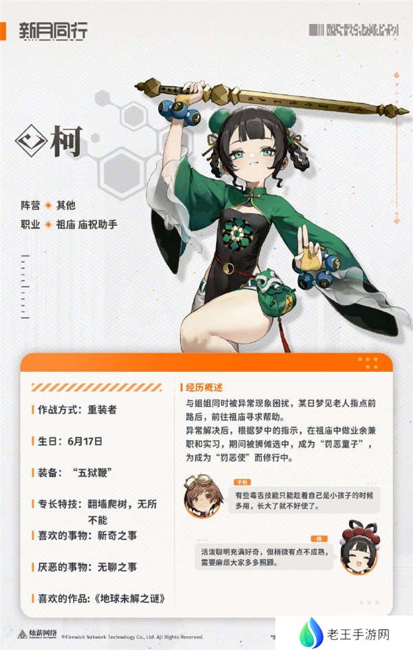 新月同行柯角色技能介绍,重装柯怎么样。与姐姐同时被异常现象困扰,某日梦见老人指点前路后,前往祖庙寻求帮助。