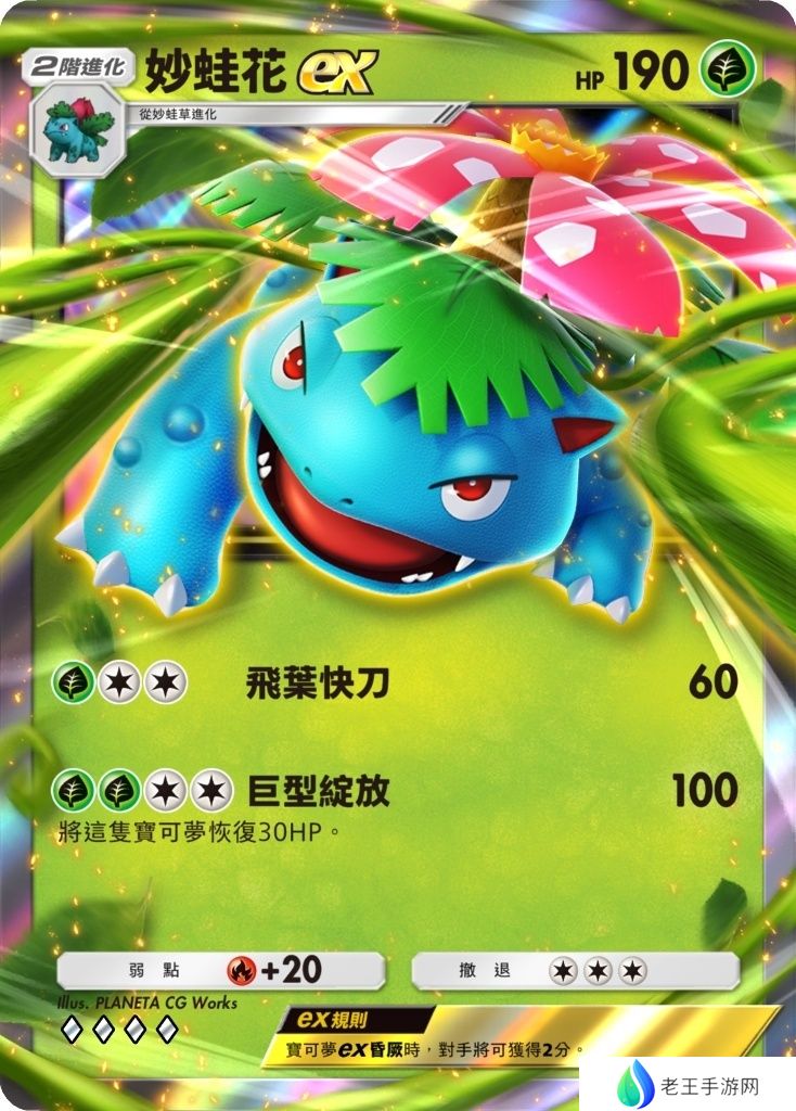 这张卡牌是插画在本作首次公开的妙蛙花ex。上头描绘了它伸出藤蔓投入对战的身姿。部分宝可梦ex的插画可透过变换角度,欣赏到插画生动逼真的视觉表现。