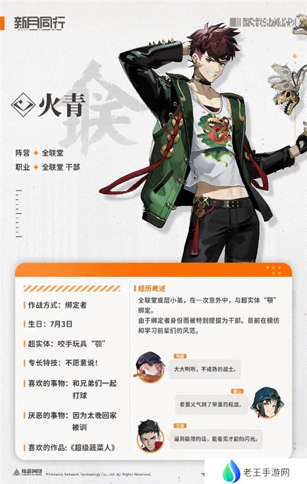 新月同行火青角色介绍,绑定者火青。全联堂底层小弟,在一次意外中,与超实体“颚”绑定。