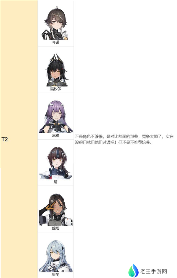 不是T2角色不够强,是对比前面的那些,竞争太弱了,实在没得用就用他们过渡吧!但还是不推荐培养,T2角色就不做详细介绍了。