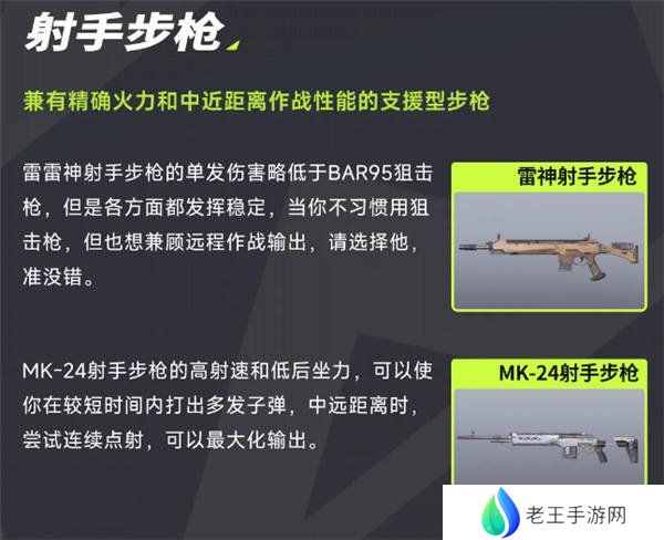 雷雷神射手步枪的单发伤害略低于BAR95狙击枪,但是各方面都发挥稳定,当你不习惯用狙击枪,但也想兼顾远程作战输出,请选择他,准没错。