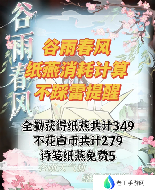 代号鸢谷雨春风全勤可获得纸燕公349个,不花白金币共计279个,诗笺纸燕免费5个。具体的活动攻略和纸燕获取见下。