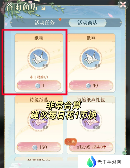在普通纸燕充足的情况下,花150白币购买特殊纸燕,比天机符直购200币和家具盲盒直购180白币合算,尤其战力党推荐用诗笺纸燕换天机符,要下池子抽密探的话转到天机符用150真的很划算,强烈推荐!