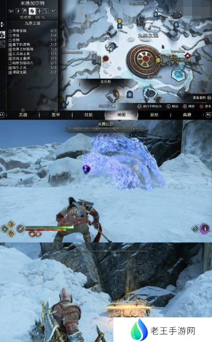 在「米德加尔特 - 九界之湖」,用长矛引爆下图的冰块,击败 Boss「冰霜幻影」,获得「护身符附魔 - 约顿海姆坚韧」,开启「传奇宝箱」,获得「长矛组件 - 雄狮之吼尾钉」。