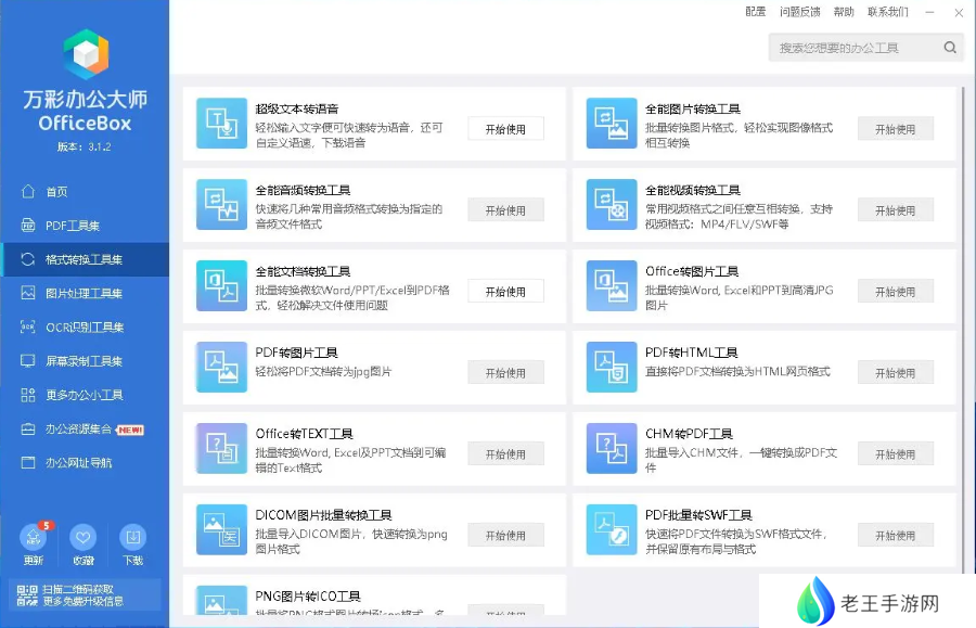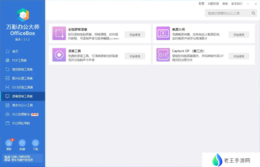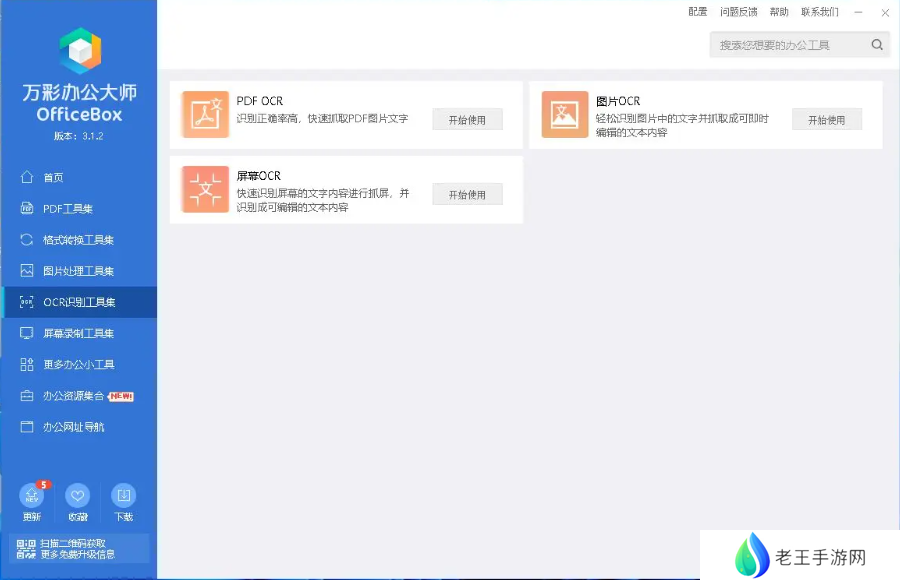 4.万彩办公大师提供了文档、音频/视频、图像转换工具集、OCR工具集、屏幕录制工具集、图像处理工具集、文件处理工具集等功能。