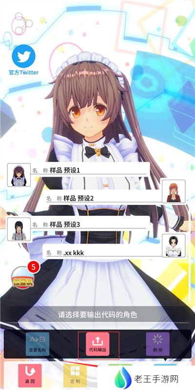 游戏内点击【定制】-【其它】-【选择要输出代码的角色】-【代码输出】
