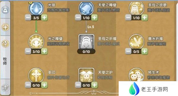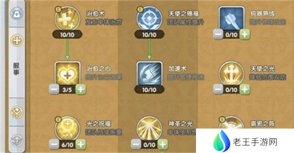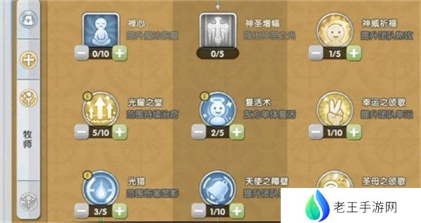 3.牧师阶段必满技能:天赐、加速、钝器熟练、圣印、幸运歌、神威祈福。