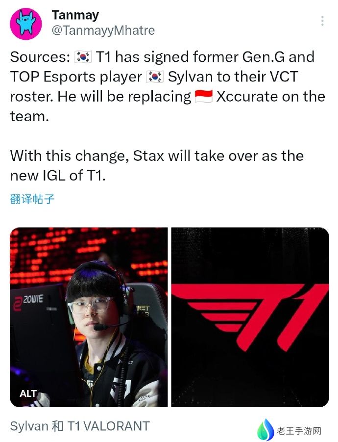 根据国外媒体人Tanmay消息,T1签下了前Gen.G、滔搏选手Sylvan,他将取代Xccurate成为T1的VCT阵容成员,而Stax将担任T1的新任指挥。