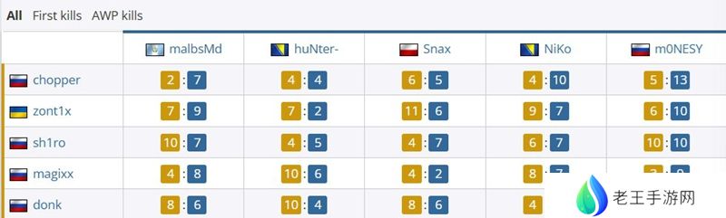 全部对位方面,malbsMd发挥出色,除了面对donk和狙击手sh1ro时略占下风,剩余面对其他Spirit选手都顺利拿下。NiKo则从对位数据上颇为针对donk,面对donk打出了13-4的数据。