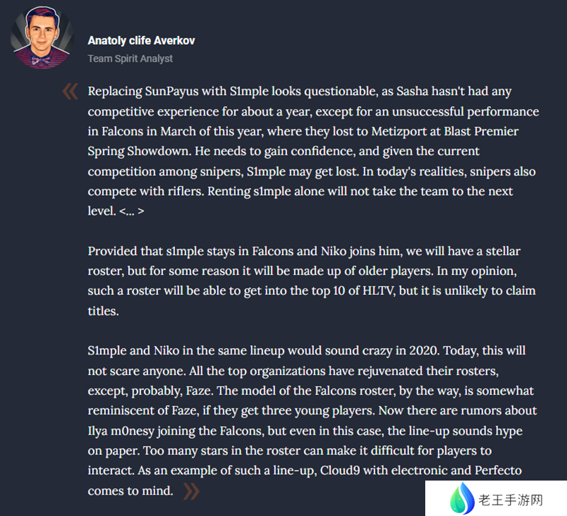“用s1mple替换SunPayus看起来让人心生疑虑,因为s1mple已经有大约一年没有任何比赛了,除了今年三月在Falcons的一次不成功的表现之外——他们在Blast Premier春季复活赛中输给了