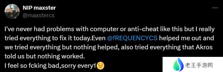maxster也在社交平台上解释了此事:“我从来没有遇到过这样的电脑或反作弊问题,但今天我真的试了一切方法。甚至fREQUENCYCS也帮了我,我们也尝试了一切方法,但都没有任何效果,也尝试了Akros告诉我们的各种方案,但都没有任何作用。